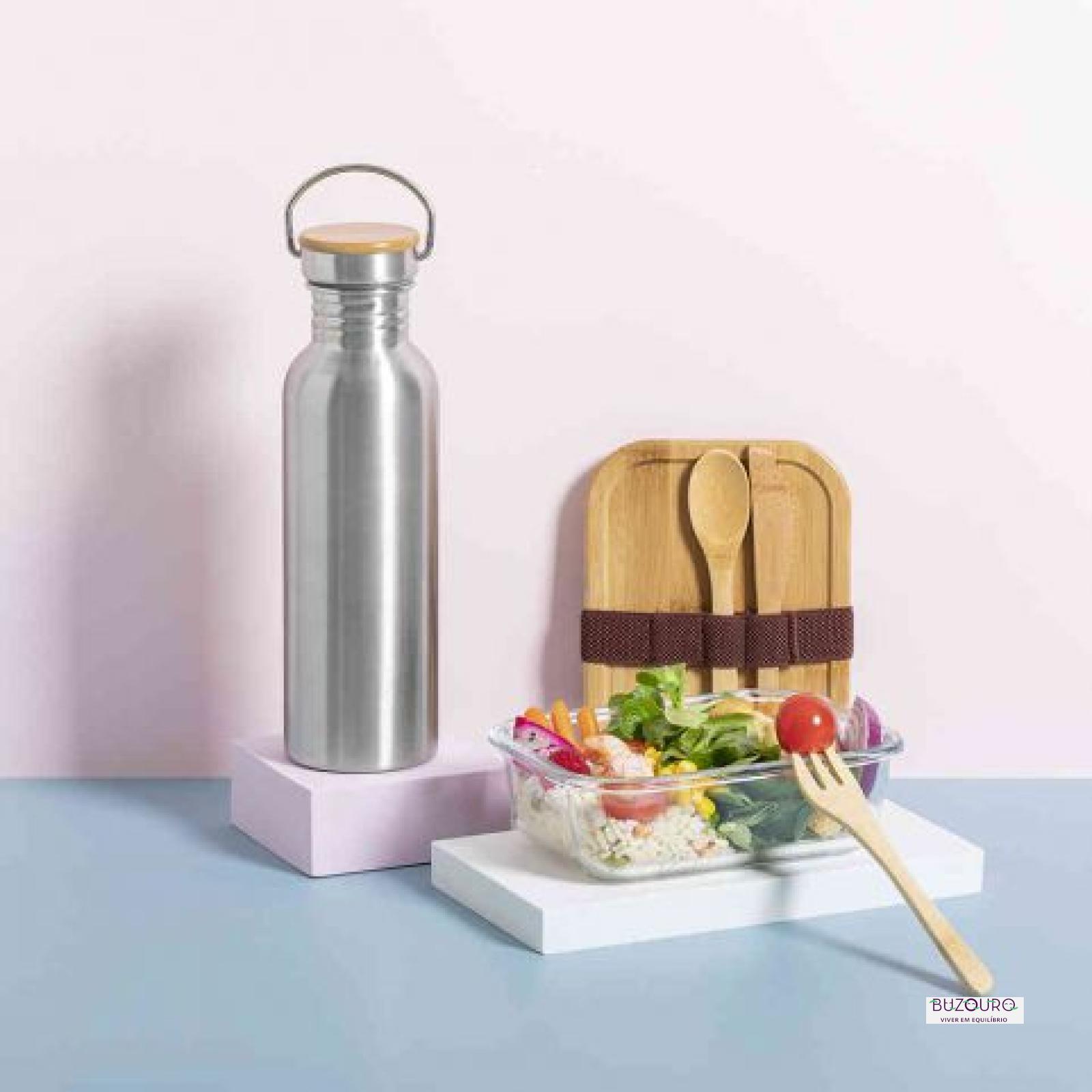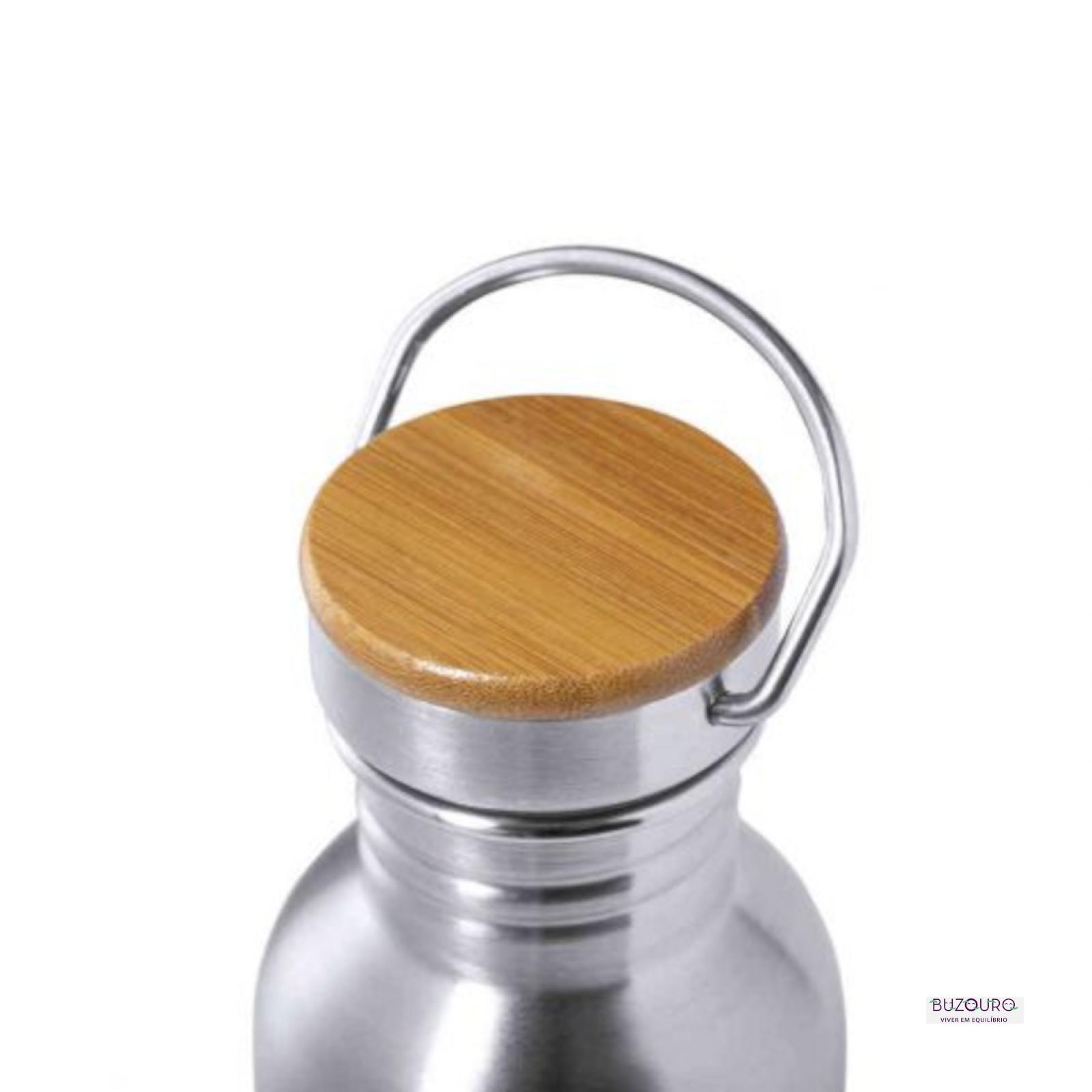 Garrafa de linha nature e de 800ml de capacidade. Corpo fabricado em aço inox e tampa de bambu com original asa metálica. Apresentada numa atrativa caixa de design eco.