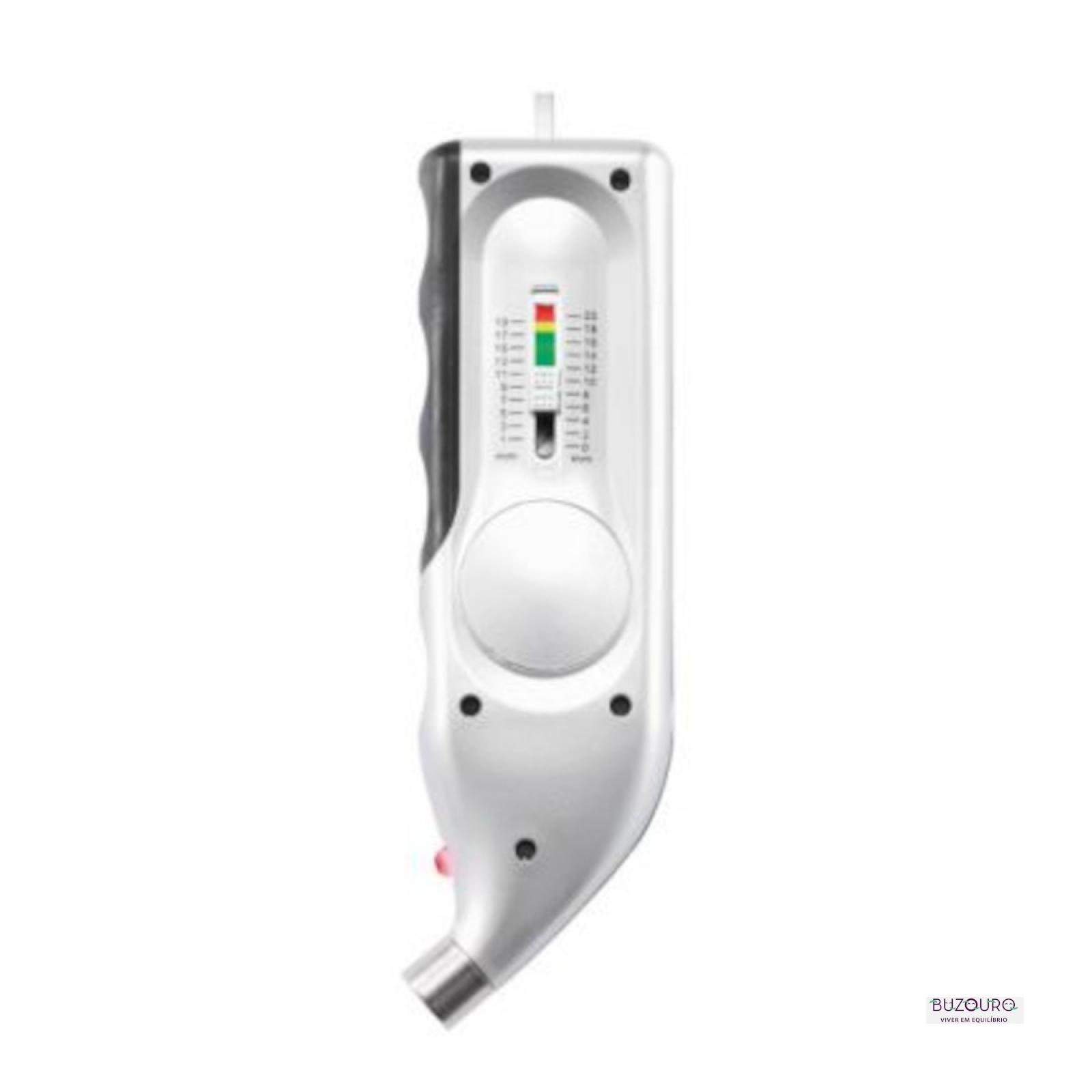 Manómetro digital com indicador de pressão e profundidade. Corpo em ABS com led vermelho e punho preto com luz de fundo. Faixa 5-100 psi, 0,5-7 bar, 50-700 kpa.