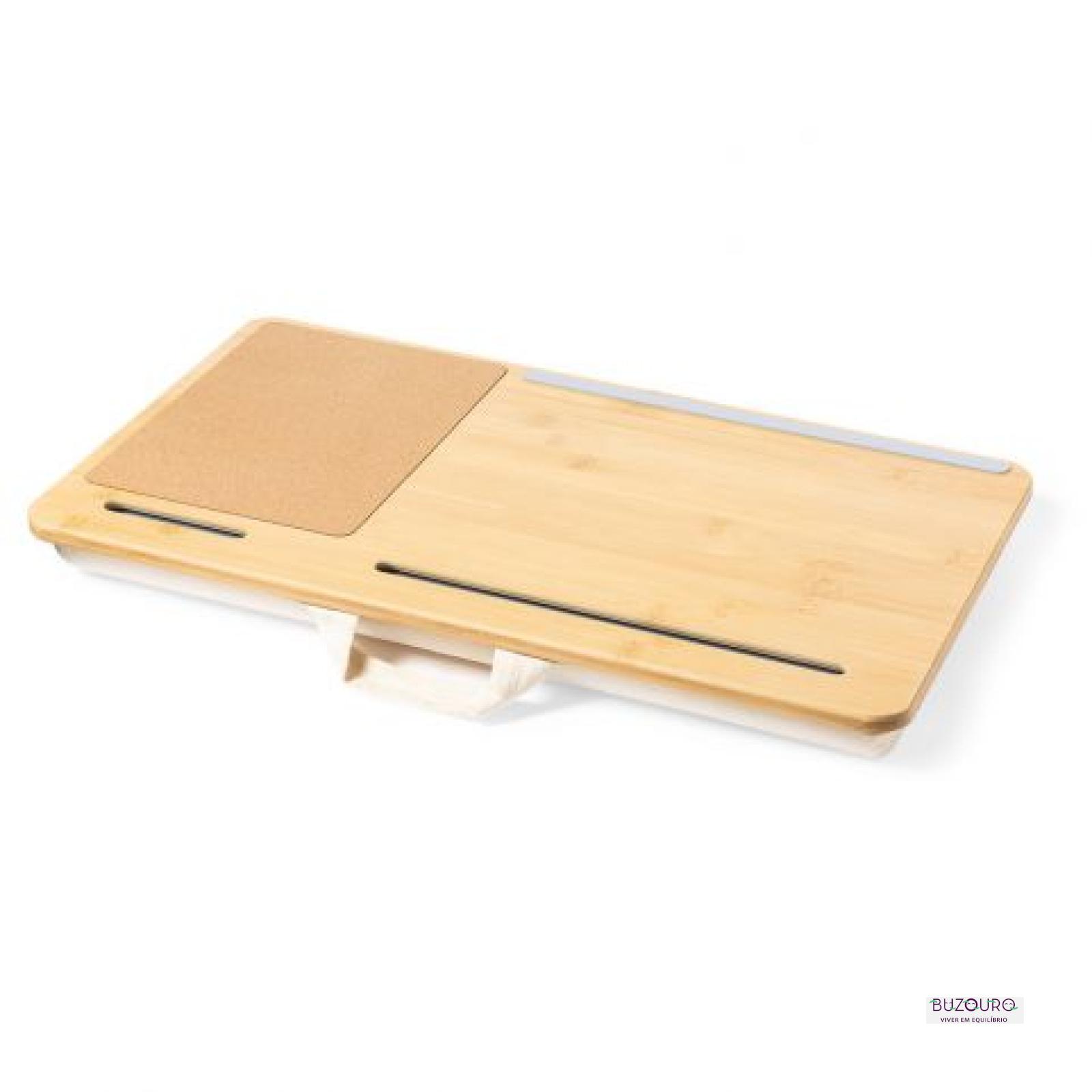 Tapete organizador multifuncional de linha nature. Está fabricado em bambu e cortiça natural, ajudando a sustentabilidade do planeta. Inclui suportes para computador portátil, tablets e outros dispositivos móveis. Com tapete para rato integrado e de tato suave. Além disso, incorpora acolchoado para os joelhos, facilitando a sua utilização durante longos períodos de maneira confortável. Inclui prática pega de transporte.