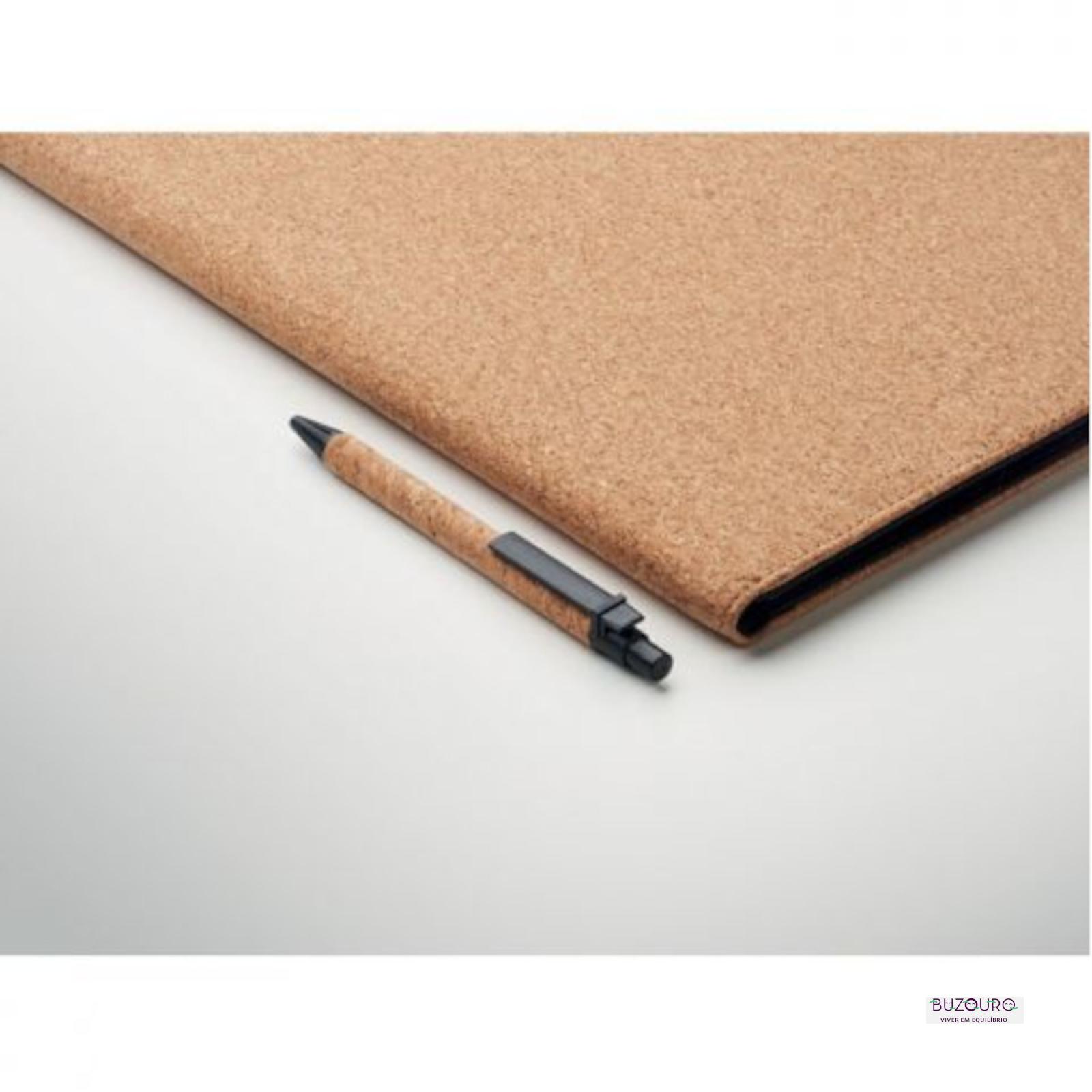 Porta documentos com bloco de notas A4 em cortiça. Bloco de notas A4. 25 folhas pautadas de papel reciclado. Esferográfica e porta-canetas a condizer. 2 compartimentos para cartões e um compartimento grande.
