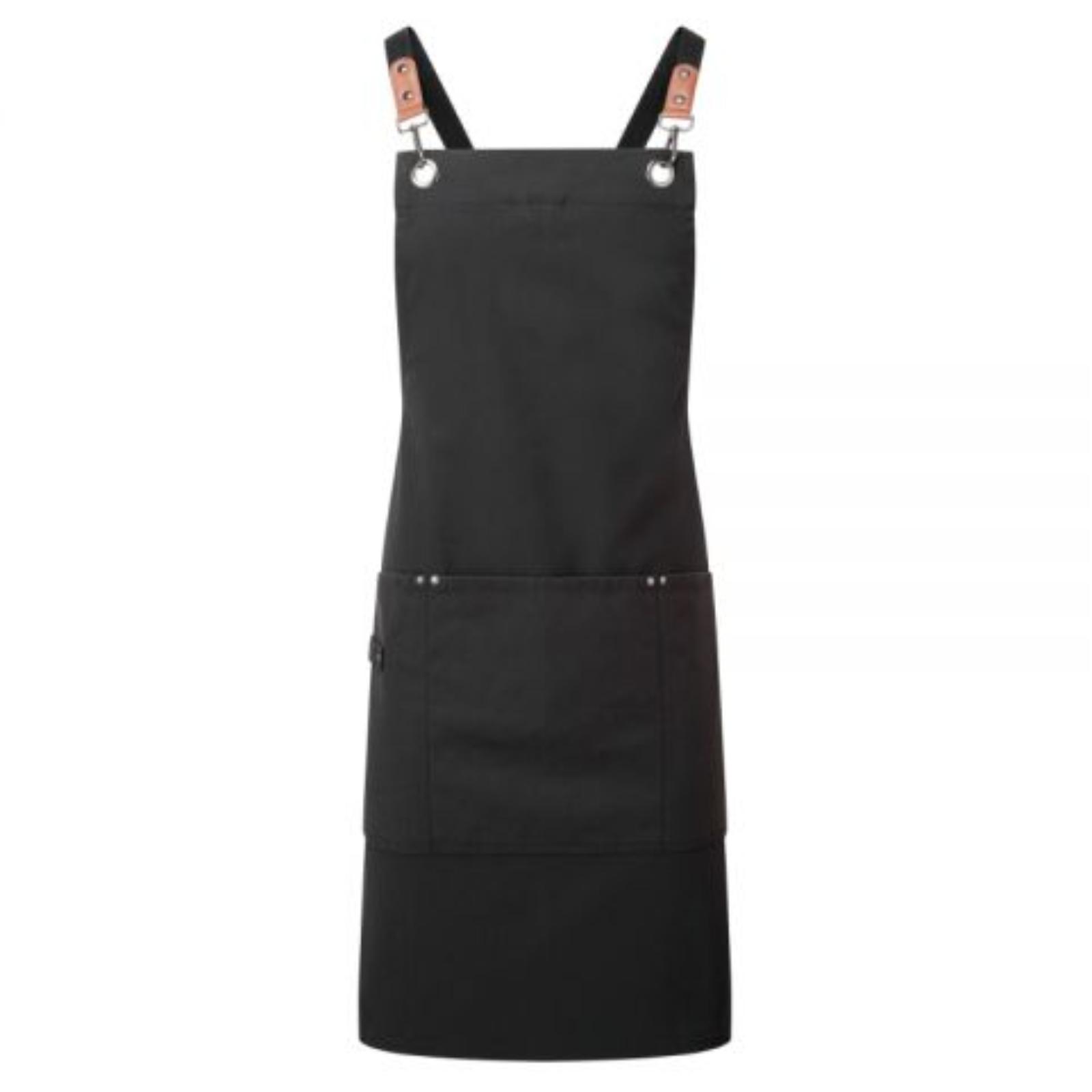 60% algodão/40% poliéster reciclado. Cruzadas nas costas, as alças do avental são fabricadas num tecido em espinhado de cor sólida e são fixadas ao avental por fechos que se prendem a ilhós.