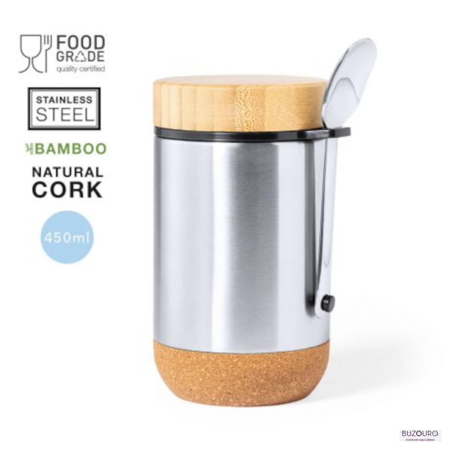 Lancheira da linha nature com 450 ml de capacidade. Corpo em aço inoxidável, com base em cortiça para manter a temperatura e tampa de segurança em bambu, com acessório de fixação para colher de aço inoxidável (incluída). Apresentado numa caixa individual de design eco em cartão kraft.